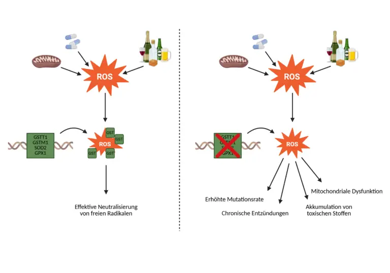 Bei genetisch bedingtem Funktionsverlust dieser Entgiftungsenzyme – etwa durch eine homozygote Deletion des GSTM1- oder GSTT1-Gens (sogenannte Null-Allele) fehlt dieser Schutzmechanismus vollständig. In solchen Fällen kommt es zu einer stärkeren Akkumulation von toxischen Zwischenprodukten, einem erhöhten oxidativen Stresslevel und potenziell einer verstärkten mitochondrialen Dysfunktion. Auch bestimmte Polymorphismen in SOD2 (z. B. der rs4880) oder GPX1 (z. B. rs1050450) können die Aktivität dieser Enzyme beeinträchtigen und die antioxidative Schutzwirkung weiter verringern.