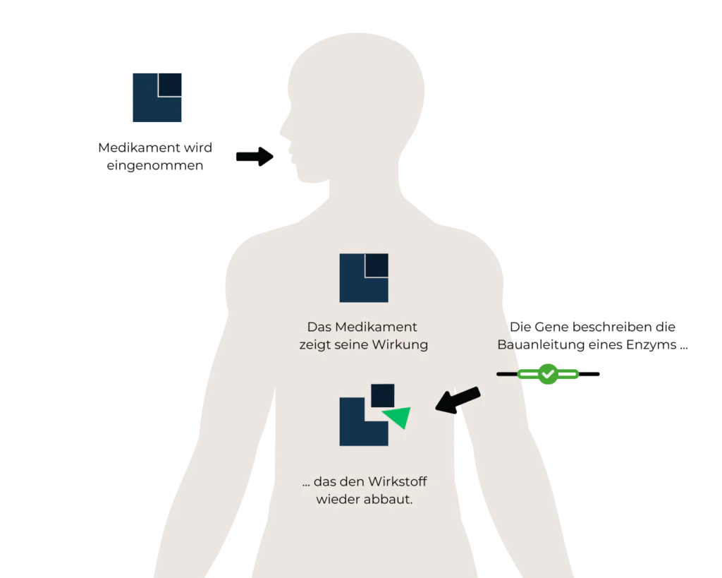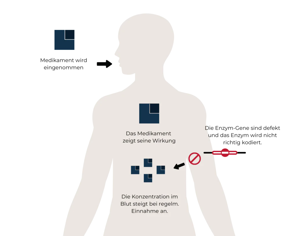 Nachdem ein Medikament seine Wirkung entfaltet hat, wird es im Körper abgebaut, um ausgeschieden werden zu können. Dieser Prozess ist essentiell, um zu verhindern, dass sich Wirkstoffe im Körper anreichern und toxische Konzentrationen erreichen. Im Mittelpunkt stehen dabei vor allem jene Gene, die für den Abbau von Medikamenten verantwortlich sind. Diese Gene kodieren für Enzyme, die unterschiedlich aktiv sein können – deswegen spricht man je Enzym von unterschiedlichen „Metabolizer-Typen“: