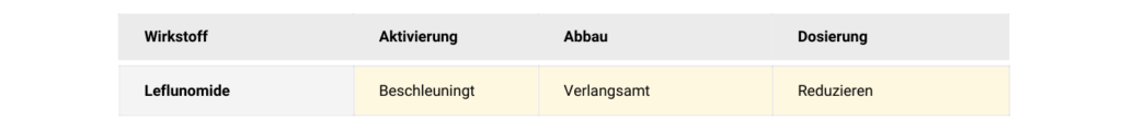 Angenommen, Ihnen wurde ein Antirheumatikum wie Leflunomide verschrieben. Der Bericht zeigt, dass die Aktivierung beschleunigt ist und der Abbau des Wirkstoffes verlangsamt. Daraus ergeben sich folgende Risiken und Maßnahmen: